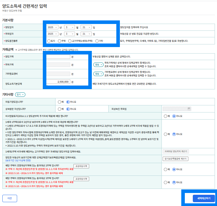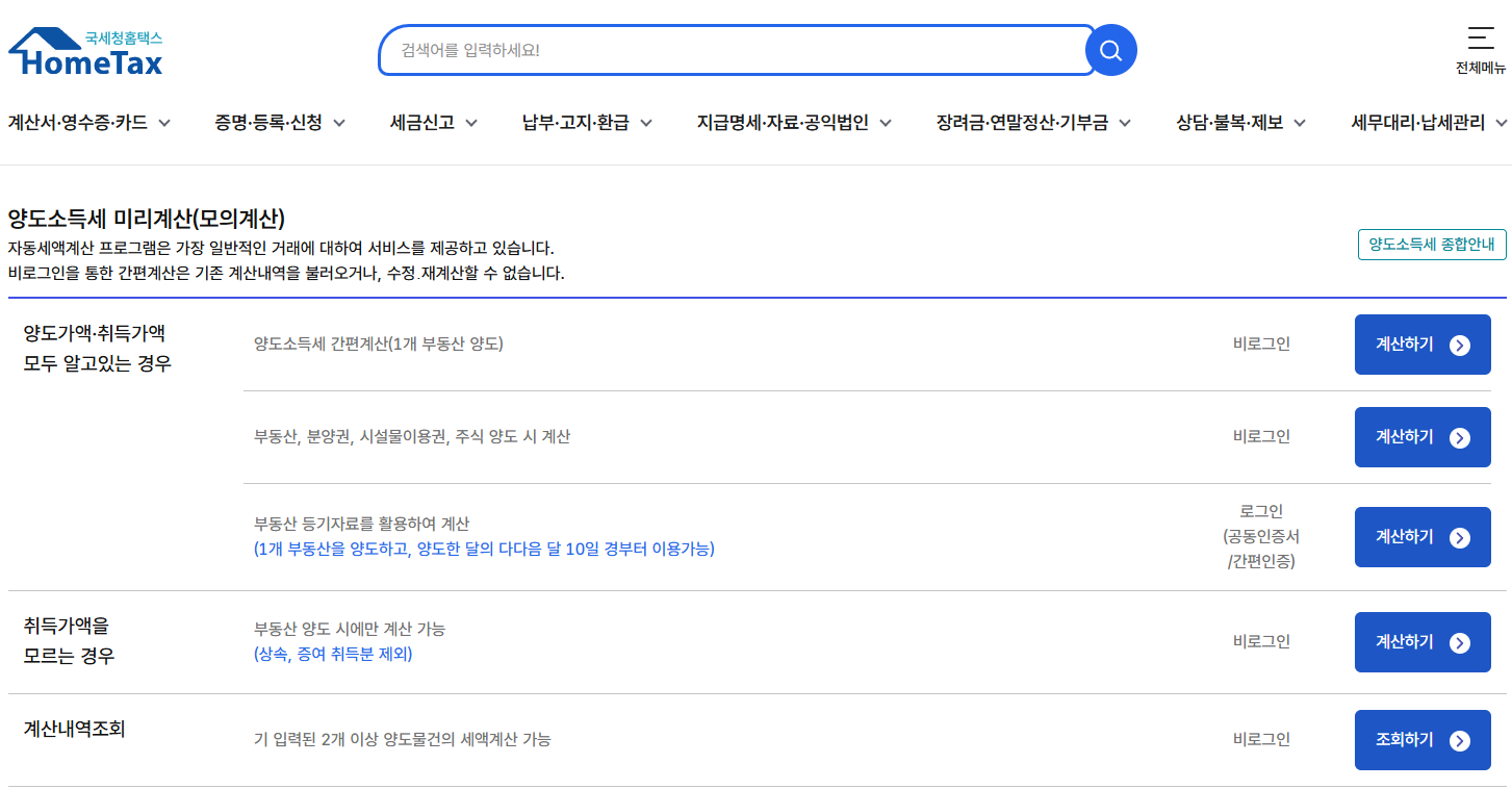 홈택스 양도소득세 자동 계산기를 이용하시면 좀 더 편리하게 계산하실 수 있습니다!