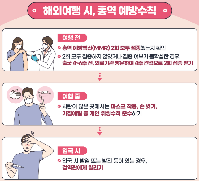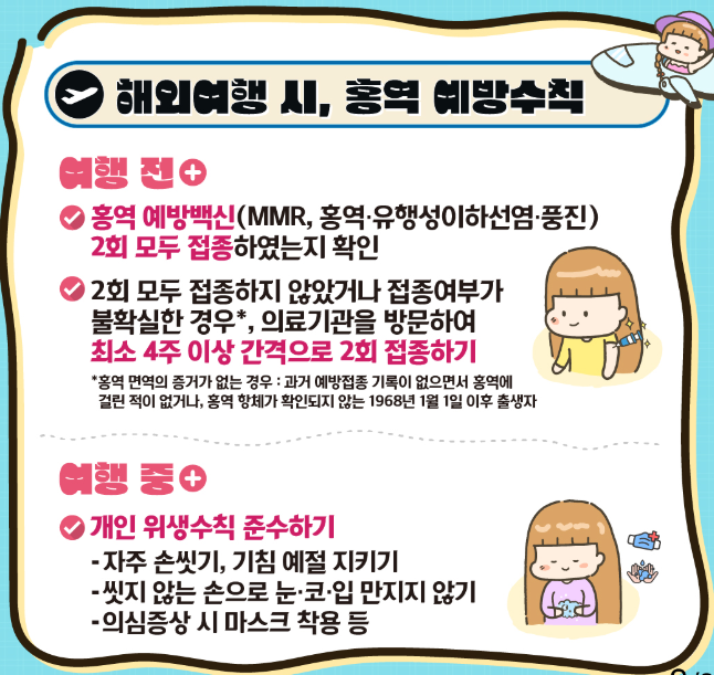 - 해외여행을 가기 전 최소 2주 전에 예방접종을 완료해야 홍역 감염을 예방할 수 있습니다.