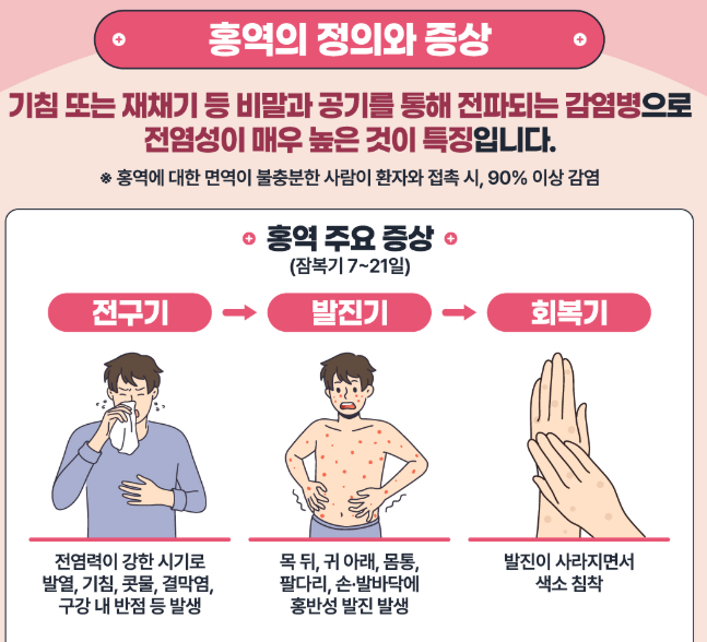 홍역(Measles)은 전염성이 매우 높은 바이러스성 질환으로, 한 번 감염되면 고열, 기침, 결막염, 전신 발진 등의 증상이 나타납니다. 심한 경우 폐렴, 뇌염, 사망으로 이어질 수 있어 예방이 필수적입니다.