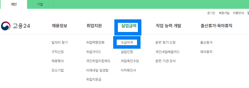 ✔ ‘실업급여’ → ‘수급자격 작성’