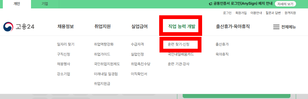 - 고용24 접속 후 국민내일배움카드 신청