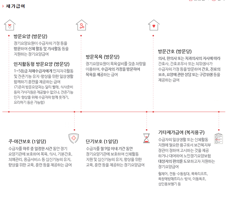 - 요양보호사 방문 서비스 (목욕, 세탁, 식사 등)