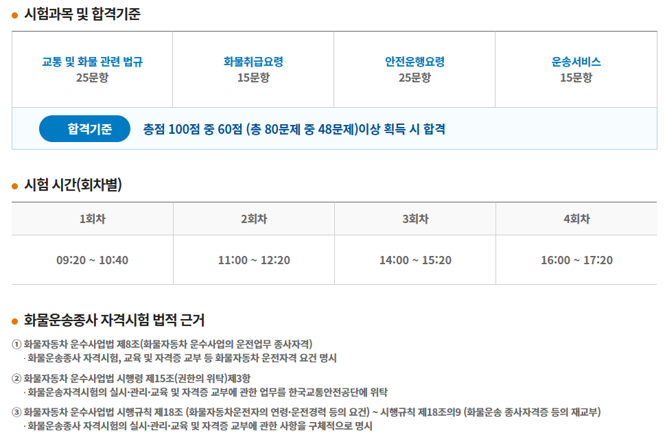 화물운송 자격시험은 상시 시험으로 운영되며, 평일에 하루 4회씩 진행됩니다.