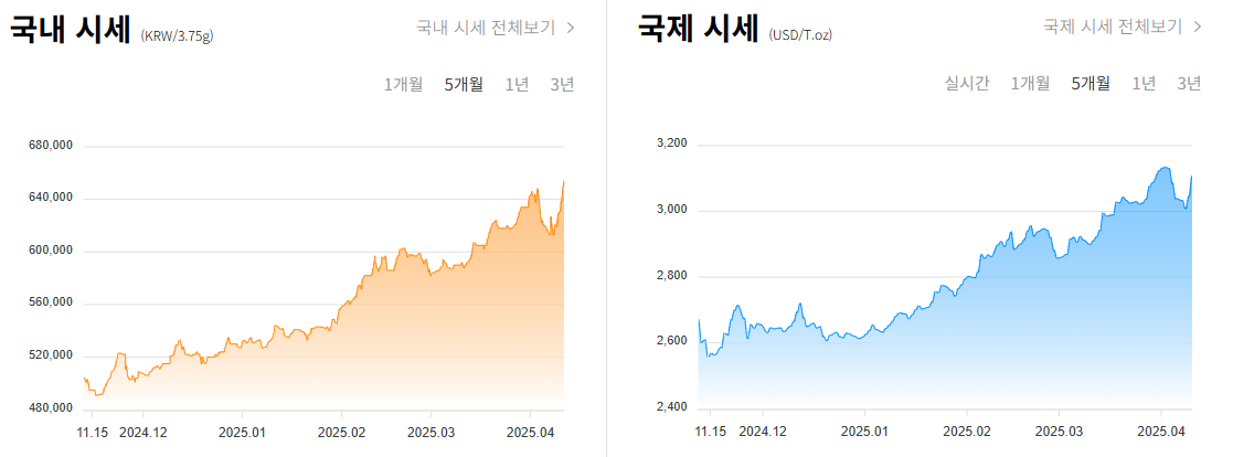 2025년 4월 기준, 국내 금 시세는 1돈 당 50만 원을 훌쩍 넘으며 최고점을 경신했습니다.