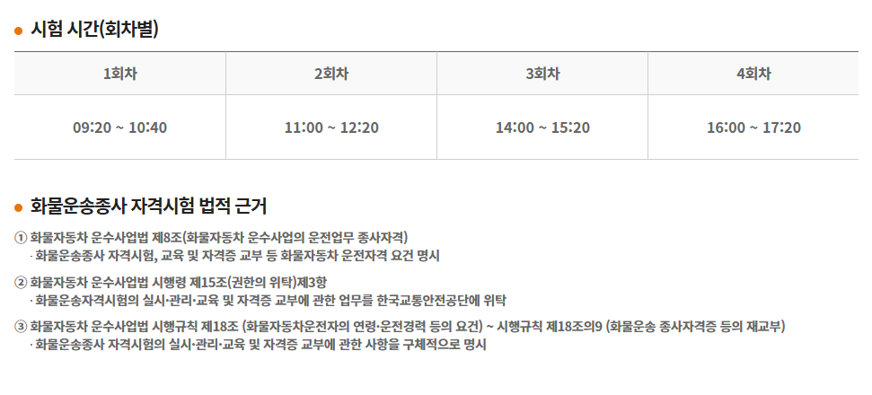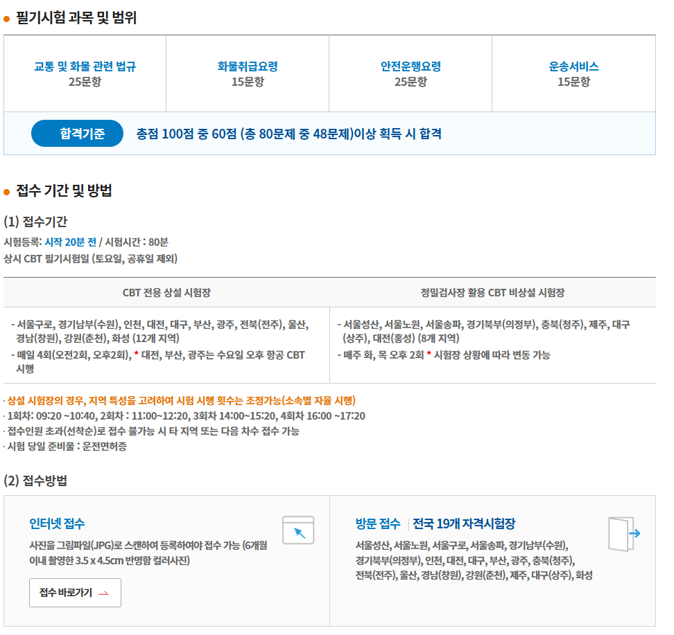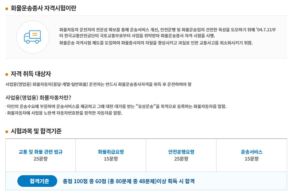 - 과목: 운송안전관리, 화물운송 법규, 자동차 관리 등