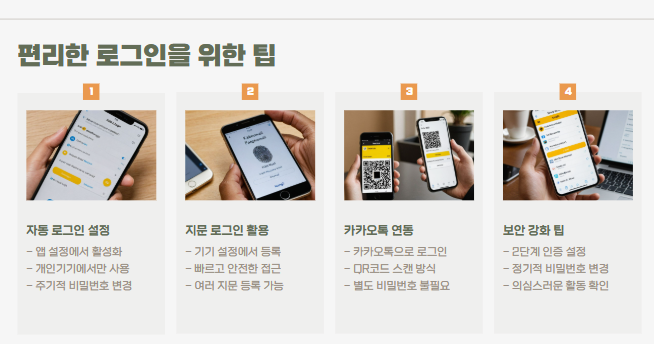 앱에서는 ‘자동 로그인’ 또는 ‘지문 로그인’ 설정하면 편해요!