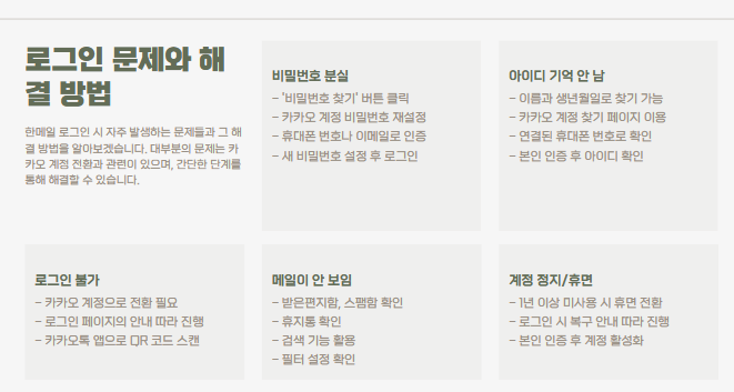 | 한메일 주소로 안 들어가져요 | 카카오 계정 전환 필요해요 → 로그인 후 안내 따라 진행 |