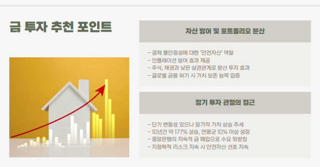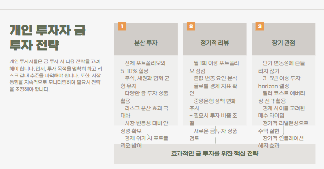 - 금은 배당이 없기 때문에 자산 방어용 + 포트폴리오 분산용으로 접근