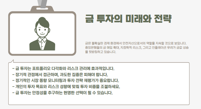 이러한 흐름을 종합해 볼 때, 2025년 현재 금값은 단순한 급등을 넘어 자산 보호, 인플레이션 방어, 리스크 분산 수단으로써의 장기 투자처로 부상하고 있다고 볼 수 있습니다.