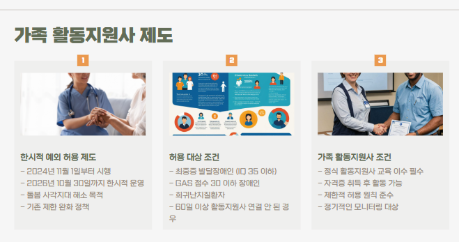 기존에는 가족은 활동지원사가 될 수 없도록 제한되어 있었지만, 2024년부터 한시적으로 예외 허용 제도가 시행 중입니다.