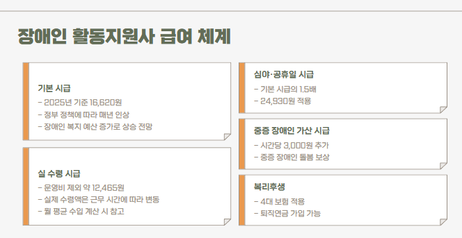 2025년 기준 활동지원사의 급여 체계는 다음과 같습니다.