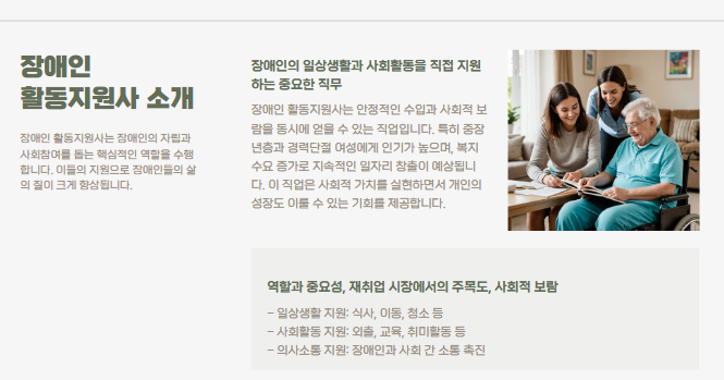 장애인 활동지원사는 장애인의 일상생활과 사회활동을 직접 지원하는 중요한 일자리입니다.