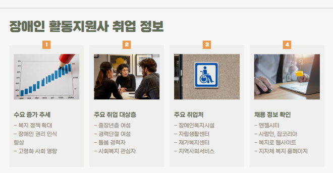 활동지원사 수요는 계속 증가 중이며, 특히 중장년층 여성, 경력단절 여성, 돌봄 경력자들에게 인기 있는 직업입니다.