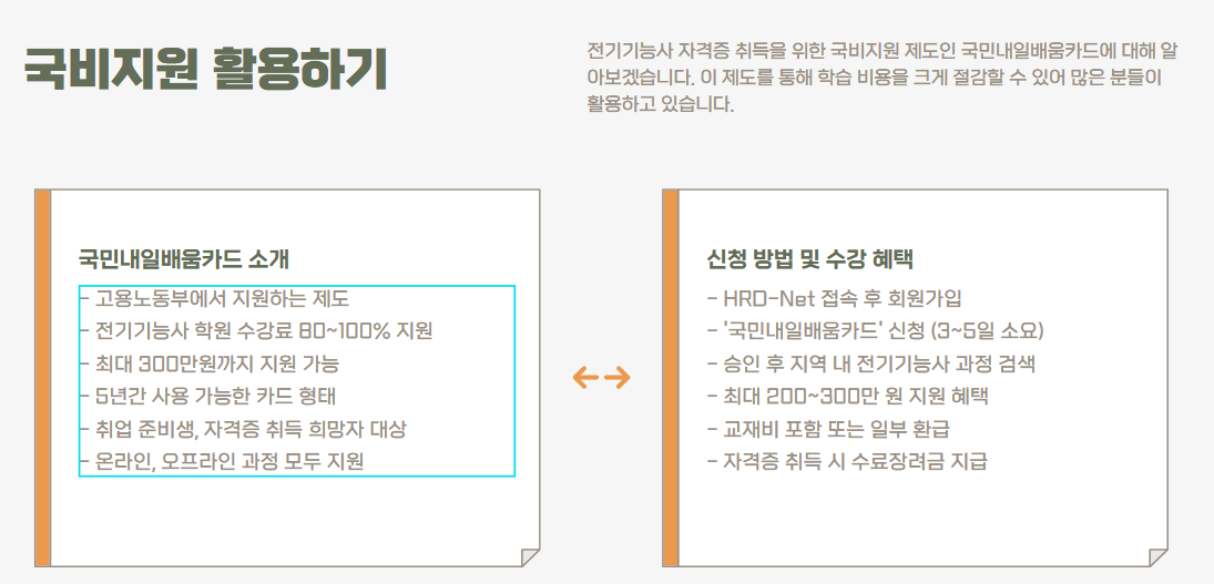 고용노동부에서 지원하는 ‘국민내일배움카드’를 이용하면 전기기능사 학원 수강료를 80~100%까지 지원받을 수 있습니다.