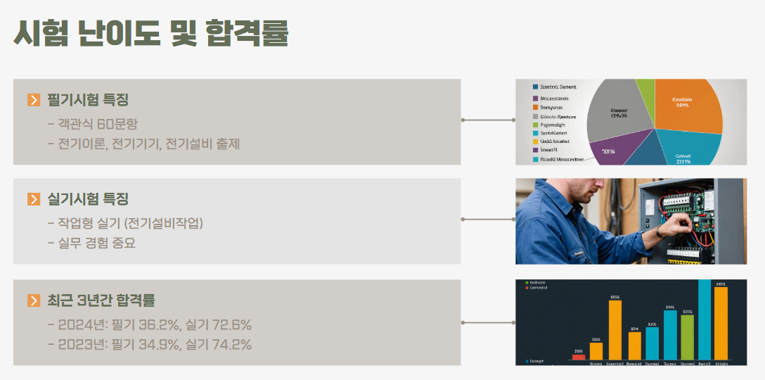 - 필기시험: 객관식 60문항 (전기이론, 전기기기, 전기설비)