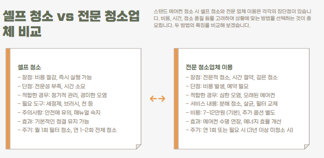 오늘은 스탠드 에어컨 셀프 청소 방법부터 청소용품 추천, 그리고 전문 청소업체 이용 시 장단점 비교까지 모두 알려드립니다.